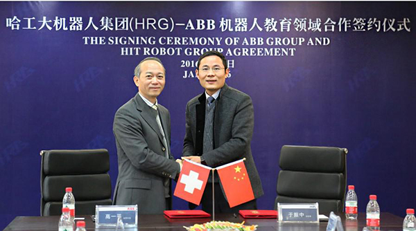 2016年1月6日上午,哈工大机器人集团(HRG)工业机器人有限公司与ABB集团上海ABB工程有限公司就工业应用与机器人教学领域签订合作协议。
