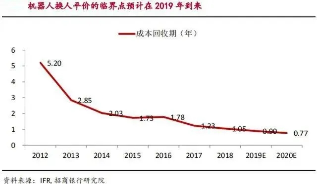 同时,随着工业机器人本地化进程的加快,工业机器人的价格有所下降,工业机器人的生产效率明显高于人类。未来工业机器人的投资回收周期预计将进一步缩短。