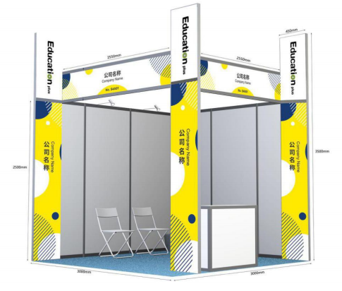 标准展位:一张洽谈桌、两把椅子、两盏射灯、三面围板、一个 220V/5A 电源插座。